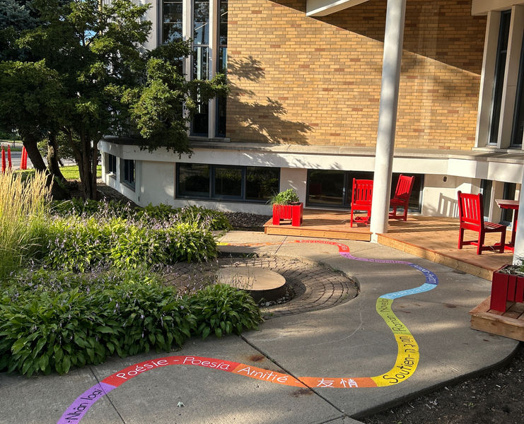 I worked with a group of children from a nearby school to get inspired to do the drawings and with a group of adults of the government French learning program to add the words to the path which represent all the languages spoken in the Vieux-Saint-Laurent by all the immigrants living there!